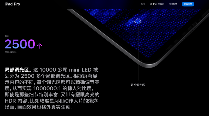 在今年4月蘋(píng)果公司的2021年春季新品發(fā)布會(huì )上,配備全新Liquid Retina XDR顯示屏的12.9英寸iPad Pro問(wèn)世,并搭載了Mini LED背光顯示技術(shù)。這塊Liquid Retina XDR顯示屏采用了超過(guò)1萬(wàn)顆Mini LED,共有2596個(gè)調光分區,可實(shí)現100萬(wàn):1的超高對比度,峰值亮度達1600nits,比舊款高出了1000 nits;同時(shí)支持P3廣色域、原彩顯示和ProMotion自適應刷新率等高端技術(shù)。